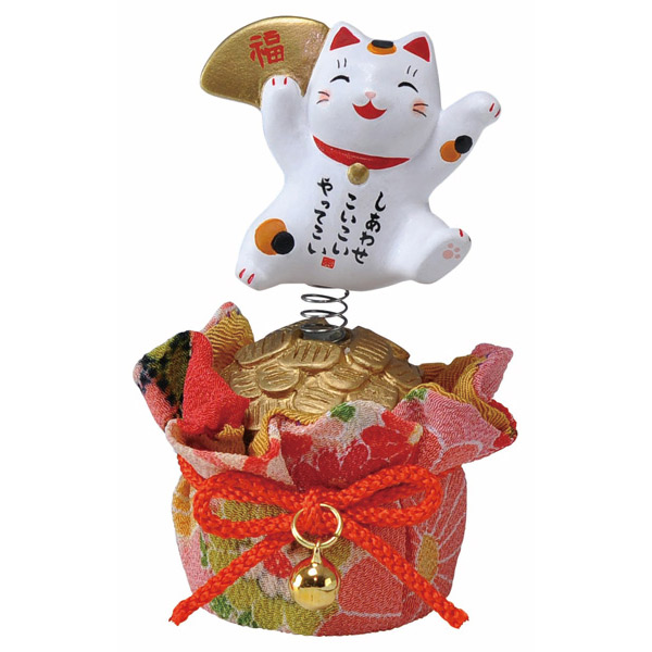 Maneki Neko แมวกวักสปริงถือพัดกองทอง ประดับด้วยผ้ากิโมโน 9.5 cm